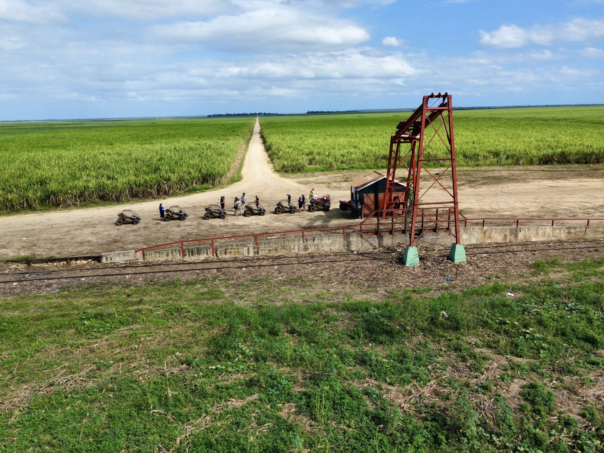 Et c’est là que l’excursion prend un nouveau visage. Les pistes se transforment, les flaques se multiplient, la conduite devient plus vivante. Les passagers hurlent de rire en passant dans les trous d’eau, les visages se salissent, les vêtements prennent la couleur de la terre dominicaine. L’univers tropical devient réel : celui des champs de canne à sucre, des bœufs, des ouvriers agricoles, des villages reculés.